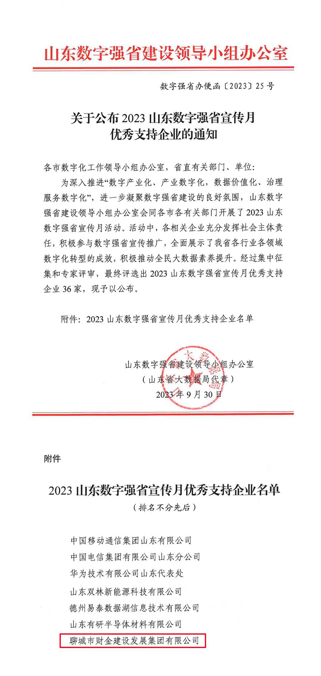 “2023山東數(shù)字強省宣傳月”活動期間,市財金集團及下屬子公司金恒智慧城市充分發(fā)揮社會主體責任,積極參與、支持配合山東數(shù)字強省建設工作,得到了社會各界的肯定,并作為唯一市屬國有企業(yè),獲評2023年數(shù)字強省宣傳月優(yōu)秀支持企業(yè)。