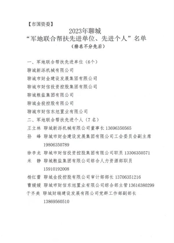 聊城市財(cái)金建設(shè)發(fā)展集團(tuán)有限公司被授予“軍地聯(lián)合幫扶先進(jìn)單位”榮譽(yù)稱號(hào),工會(huì)副主席孫峰同志被評為“軍地聯(lián)合幫扶先進(jìn)個(gè)人”。