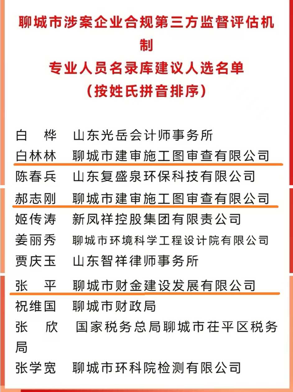 近日,聊城市涉案企業(yè)合規(guī)第三方機(jī)制管委會公示聊城市涉案企業(yè)合規(guī)第三方監(jiān)督評估機(jī)制專業(yè)人員名錄庫人員名單,我集團(tuán)審計(jì)法務(wù)部張平、圖審公司郝志剛、白林林三位同志經(jīng)公開公告、個(gè)人報(bào)名、組織推薦、管委會研究、擬入庫公示等程序,確定為聊城市涉案企業(yè)合規(guī)第三方監(jiān)督評估機(jī)制專業(yè)人員。